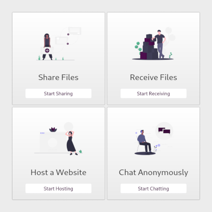Dalla schermata di benvenuto di OnionShare, puoi scegliere tra 4 diversi servizi: